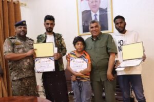 وأشاد العميد المنهالي، خلال مكأفاتهم وتكريمهم، بالموقف البطولي الذي سطّره المواطنون بمنطقة الديس وفي مقدمتهم أحمد فرج اليميني، وأيمن خالد العبد، والطفل سعيد هائل البحري الذين اعترضوا طريق المُجرم (أ.أ.ص.ب) المتهم بارتكاب عدة قضايا جنائية، مشيرًا أنهم صنعوا موقفًا جبارًا أثبت حقيقة اصطفاف المواطنين بساحل حضرموت إلى جانب أجهزتهم الأمنية في مختلف الأوقات والظروف.