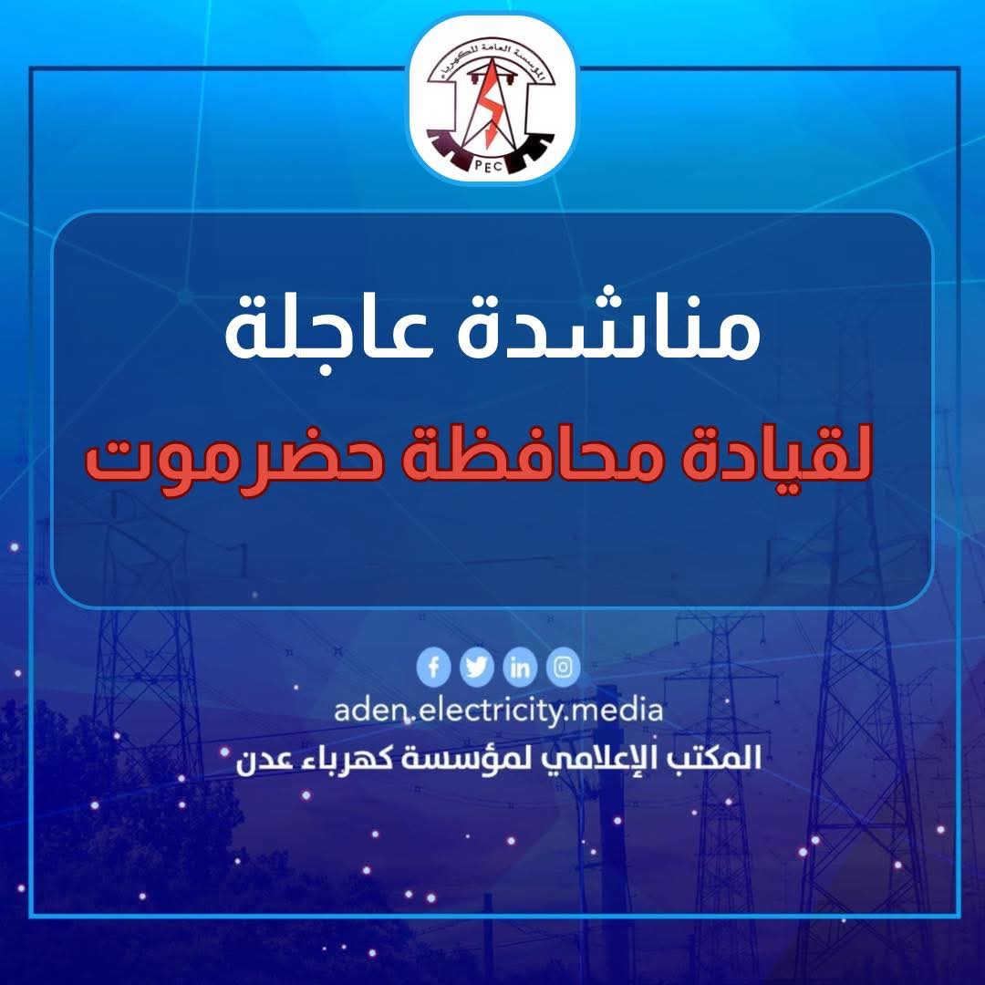 أطلقت المؤسسة العامة لكهرباء عدن، اليوم، نداءً عاجلاً إلى نائب رئيس مجلس القيادة الرئاسي اللواء فرج سالمين البحسني، ومحافظ حضرموت الأستاذ مبخوت بن ماضي، ورئيس حلف قبائل حضرموت الشيخ عمرو بن حبريش، للتدخل الفوري لضمان إمداد محطة الرئيس بكميات كافية من النفط الخام قبل توقفها المتوقع خلال الـ 24 ساعة القادمة.