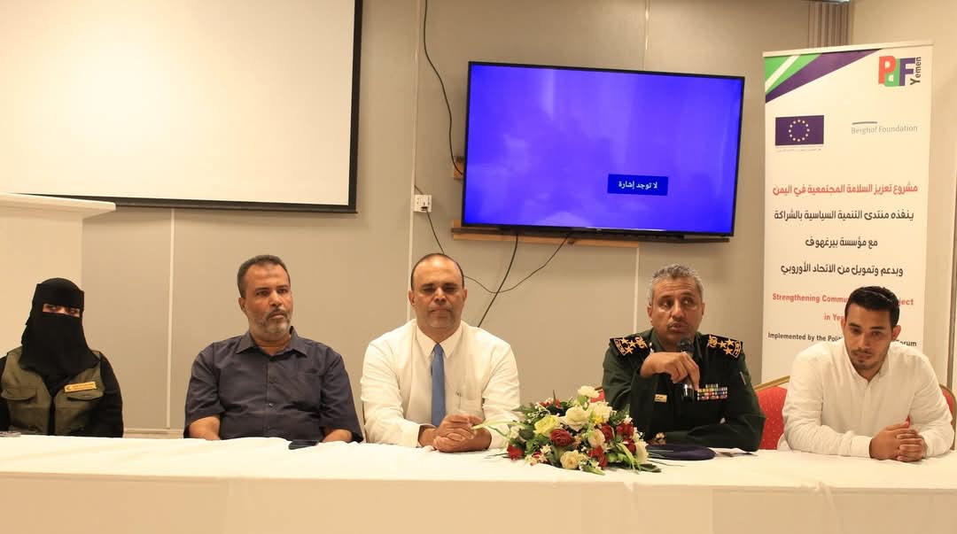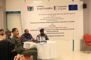 دشن منتدى التنمية السياسية ومؤسسة بيرجهوف الألمانية الدورة التدريبية الخاصة بمفاهيم السلامة المجتمعية والمهارات القانونية لمنتسبي الشرطة بالمكلا ضمن مشروع تعزيز السلامة المجتمعية في اليمن.