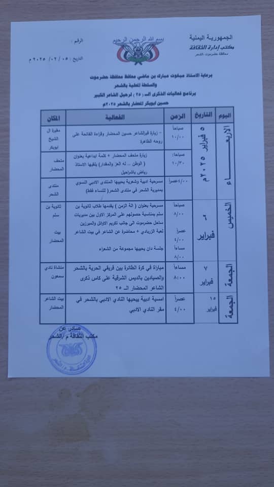 وكشفت اللجنة برنامج فعاليات هذه الذكرى في مدينة الشحر كالتالي: