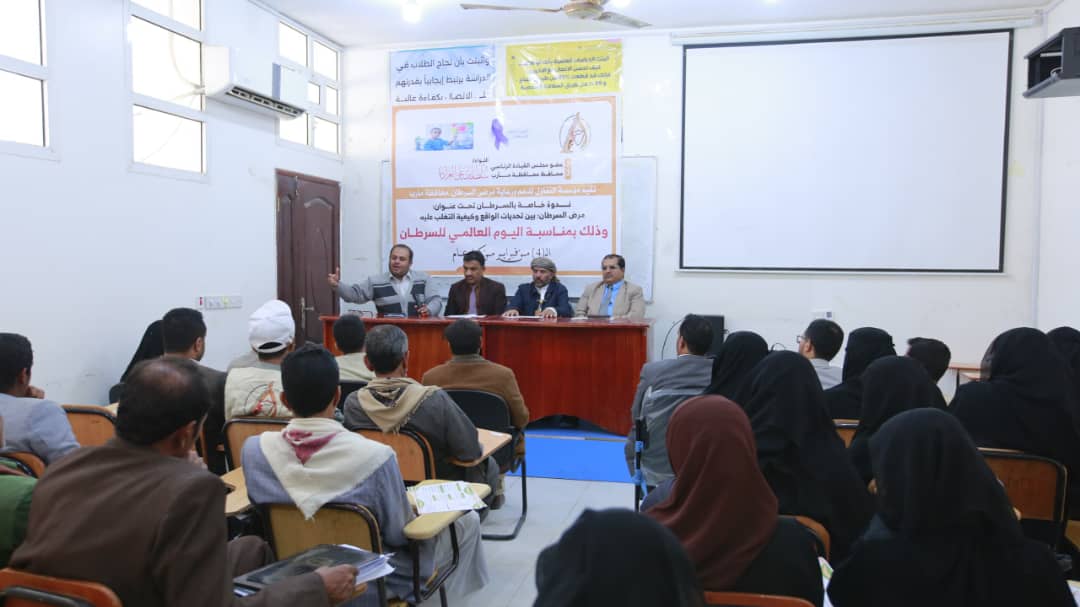 وفي افتتاح الندوة التي نظمتها مؤسسة التفاؤل لدعم ورعاية مرضى السرطان في كلية الطب بجامعة إقليم سبأ، أشار وكيل محافظة مأرب للشؤون الإدارية عبدالله الباكري، إلى خطورة ارتفاع نسب الإصابة بالمرض في المحافظة، وأهمية مضاعفة وتكثيف جهود التوعية بالأسباب التي تؤدي إلى الإصابة به.