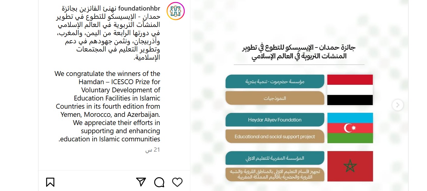 أعلنت مؤسسة حمدان بن راشد آل مكتوم للعلوم الطبية والتربوية ومنظمة العالم الإسلامي للتربية والعلوم والثقافة «إيسيسكو» فوز مؤسسة حضرموت- تنمية بشرية بالدورة الرابعة من جائزة حمدان – الإيسيسكو للتطوع في تطوير المنشآت التربوية في العالم الإسلامي.