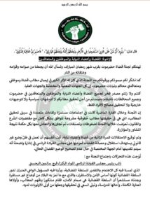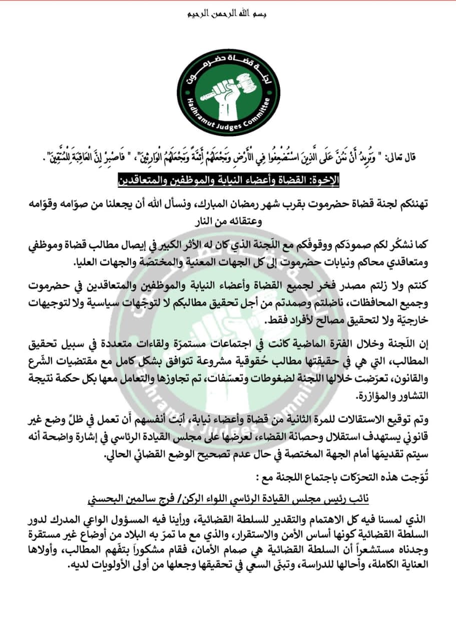 واستعرض البيان جهود اللجنة خلال الفترة الماضية واجتماعاتها المستمرة، ولقاءاتها المتعددة في سبيل تحقيق المطالب التي هي في حقيقتها مطالب حقوقية مشروعة تتوافق بشكل كامل مع مقتضيات الشرع والقانون، حيث تعرضت خلالها اللجنة لضغوطات وتعسفات، تم تجاوزها والتعامل معها بكل حكمة نتيجة التشاور والمؤازرة.. كما أنه تم توقيع الاستقالات للمرة الثانية من قضاة وأعضاء نيابة، أبت أنفسهم أن تعمل في ظل وضع غير قانوني يستهدف استقلال وحصانة القضاء، لعرضها على مجلس القيادة الرئاسي في إشارة واضحة أنه سيتم تقديمها أمام الجهة المختصة في حال عدم تصحيح الوضع القضائي الحالي.