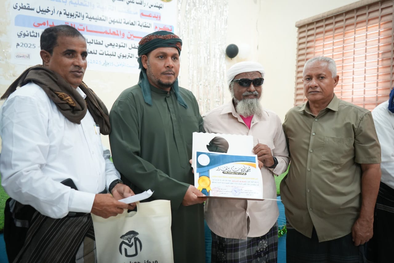 نظّمت النقابة العامة للمهن التعليمية والتربوية بمكتب التربية والتعليم بمحافظة سقطرى، اليوم، حفلاً تكريمياً للمعلمين والمعلمات القدامى تقديراً لجهودهم وعطائهم الطويل في خدمة العملية التعليمية.