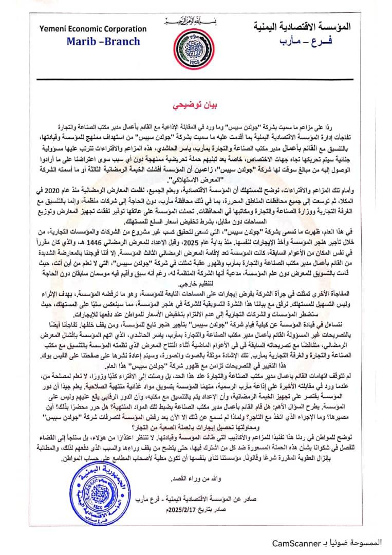 أعربت المؤسسة الاقتصادية اليمنية عن استغرابها من التصريحات الأخيرة لشركة “جولدن سيبس” والقائم بأعمال مدير مكتب الصناعة والتجارة بمحافظة مأرب، ياسر الحاشدي، التي استهدفت المؤسسة وقيادتها.