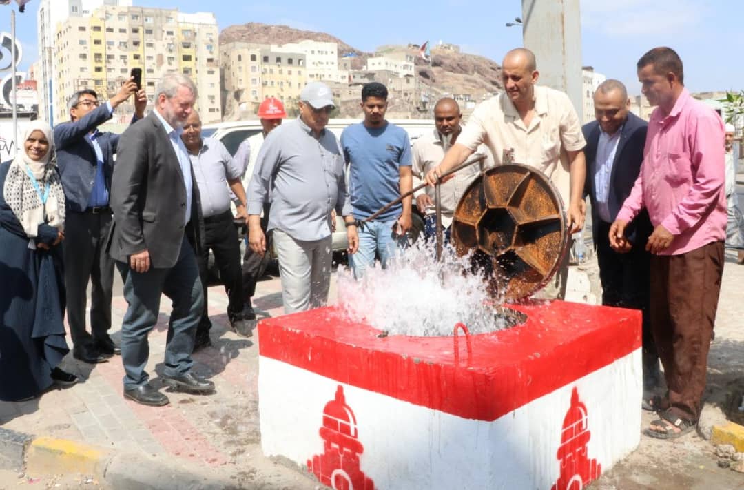 دشن أمين عام المجلس المحلي بمحافظة عدن بدر معاون، اليوم، ومعه مدير عام المؤسسة المحلية للمياه والصرف الصحي بعدن المهندس محمد باخبيرة، والممثل المقيم لمنظمة اليونيسيف في اليمن بيتر هوكينز، مشروع إعادة تأهيل خط توزيع مياه مديرية التواهي، بتكلفة 807 آلاف دولار، بتمويل البنك الألماني للتنمية عبر منظمة اليونيسيف.