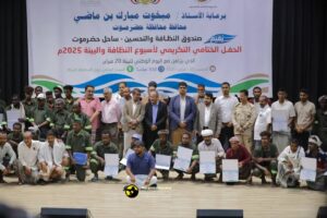 وفي الحفل الختامي ، أكد وكيل المحافظة للشؤون الفنية المهندس “أمين سعيد بارزيق ” ان اسبوع النظافة والبيئة يعد حدثا مهما لتعزيز ثقافة المجتمع بأهمية النظافة ويسهم بشكل واسع في ايصال رسائل توعوية من خلال المشاركات المجتمعية والجهات الإعلامية التي لها أهمية بالغه في بث الوعي المجتمعي عبر مختلف وسائلها المرئية والمسموعة والمقروءة ، مشيرا إلى أن إدارة الصندوق قد عملت على توفير العديد من الاحتياجات التي تسهم تحسين اوضاع العمال المعيشية وغيرها ، مؤكداً على وقوف السلطة المحلية بالمحافظ متمثلة في سيادة الأخ ” مبخوت مبارك بن ماضي” محافظ المحافظة في تسهيل كافة الإجراءات لما يتضمن سير اعمال النظافة والتحسين بالشكل الصحيح .