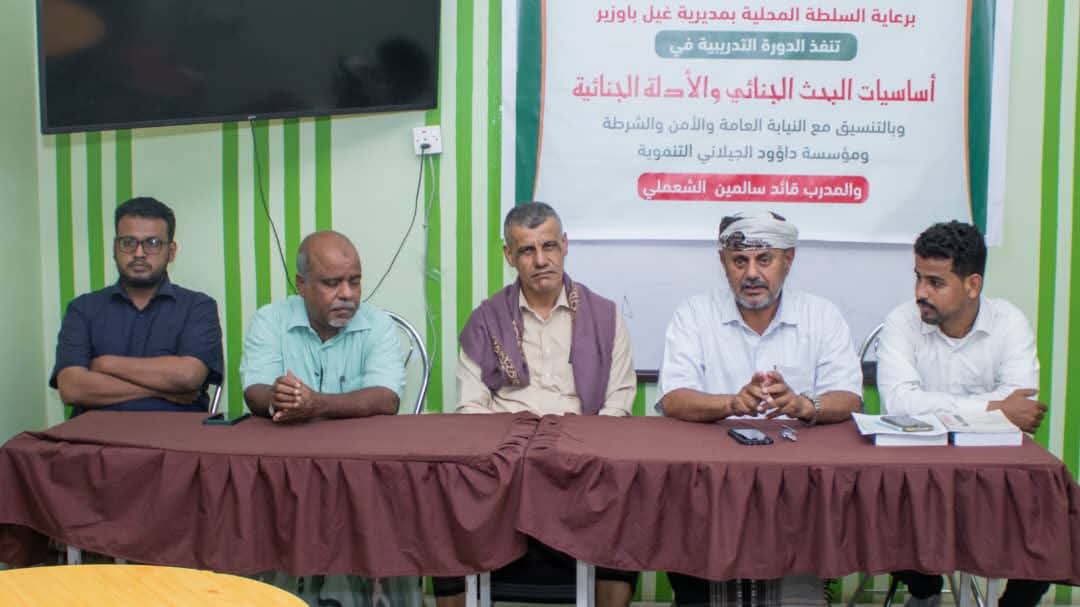 برعاية السلطة المحلية بمديرية غيل باوزير، بدأت مساء أمس دورة تدريبية متخصصة في أساسيات البحث والأدلة الجنائية، تستهدف عدد من منتسبي أمن المديرية، بالتنسيق مع النيابة العامة الابتدائية بالمديرية ومؤسسة داؤود الجيلاني التنموية، بهدف تعزيز مهارات المشاركين في مجالات البحث الجنائي وجمع الاستدلالات الأولية.