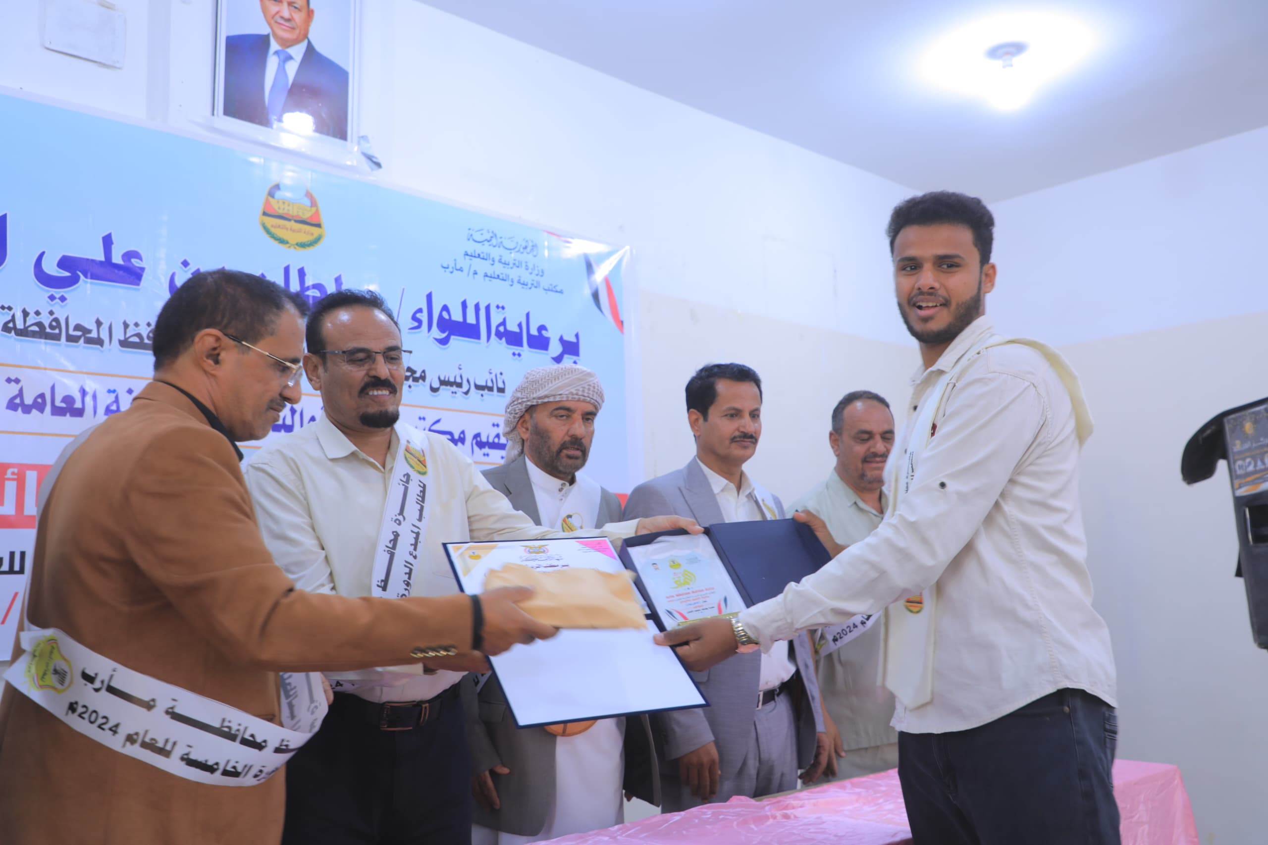 كرم نائب وزير التربية والتعليم الدكتور علي العباب، ووكيل محافظة مأرب للشؤون الإدارية عبدالله الباكري، اليوم، 18 طالباً وطالبة، الفائزين بجائزة محافظ مأرب للطالب المبدع بنسختها الخامسة للعام 2024م، بجوائزهم المالية وشهادات المشاركة.
