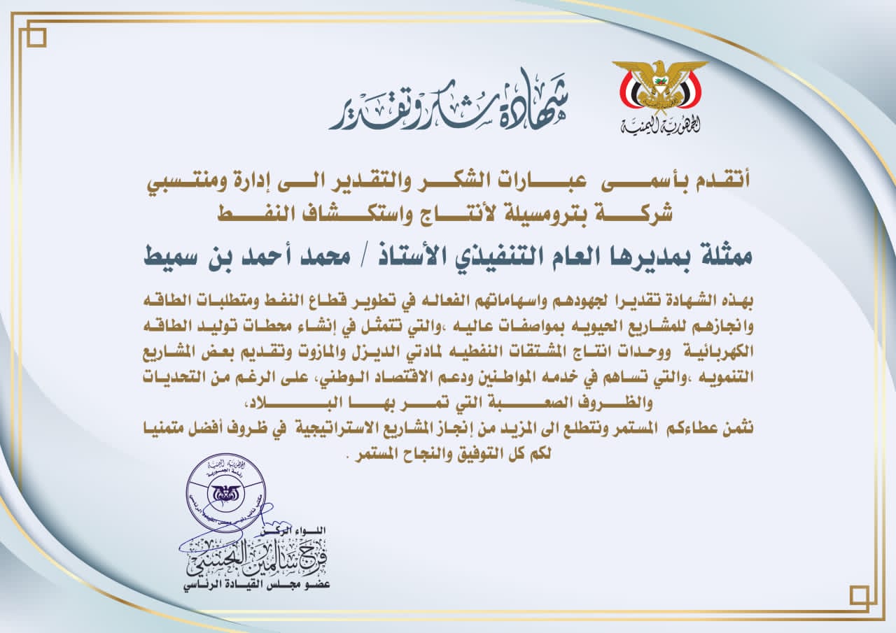 *منح عضو مجلس القيادة الرئاسي اللواء الركن فرج سالمين البحسني شركة المسيلة لاستكشاف وإنتاج البترول ” بترومسيلة ” ممثلة بالمدير العام التنفيذي الأستاذ محمد أحمد بن سميط شهادة شكر وتقدير .*