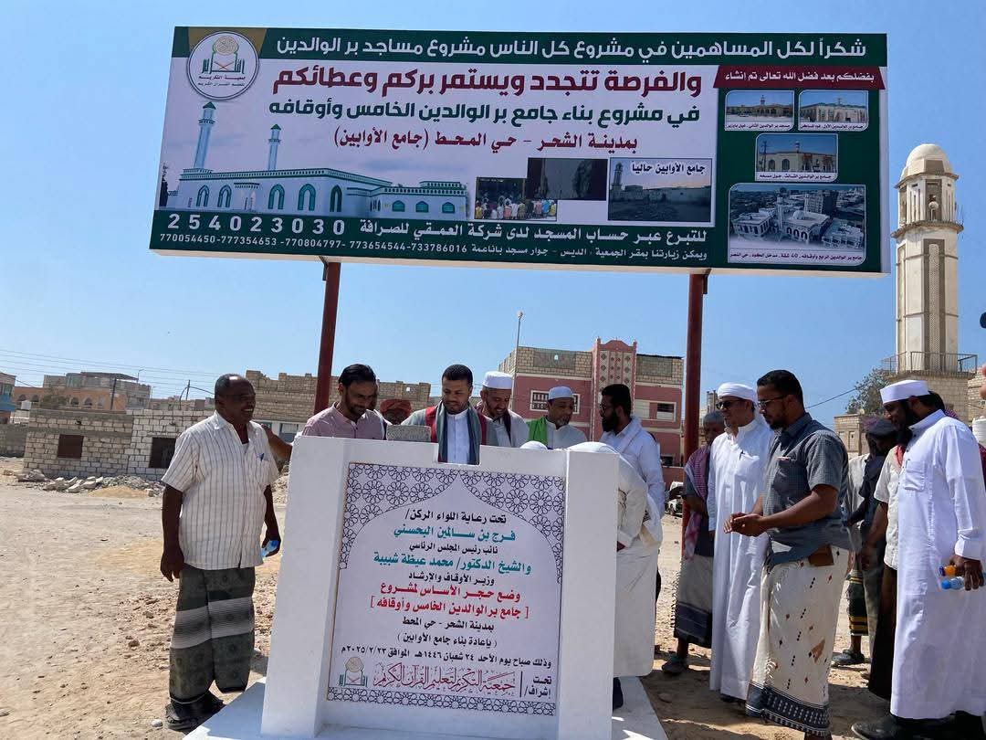 وفي إطار الزيارة، وضع الوكيل الخطري حجر الأساس لمشروع “بر الوالدين الخامس” الذي تنفذه جمعية التكريم الخيرية، ويشمل إعادة بناء مسجد الأوابين وإنشاء أوقاف تابعة له.