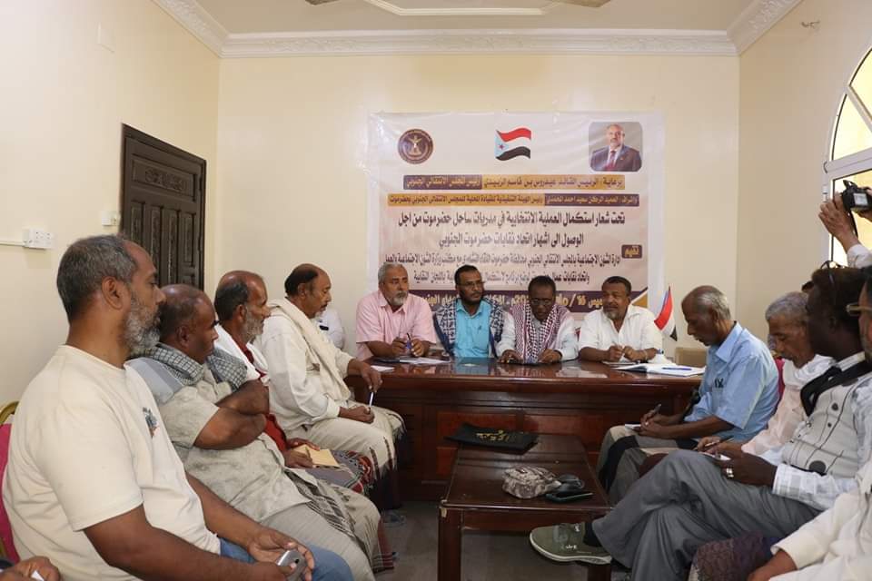 نظمت إدارة الشؤون الاجتماعية بالهيئة التنفيذية للقيادة المحلية للمجلس الانتقالي الجنوبي بمحافظة حضرموت، اليوم الخميس لقاء تشاوريا مع مكتب وزارة الشؤون الاجتماعية والعمل واتحاد نقابات عمال حضرموت، لمناقشة استكمال برنامج العملية الانتخابية لللجان النقابية بمديريات الساحل..