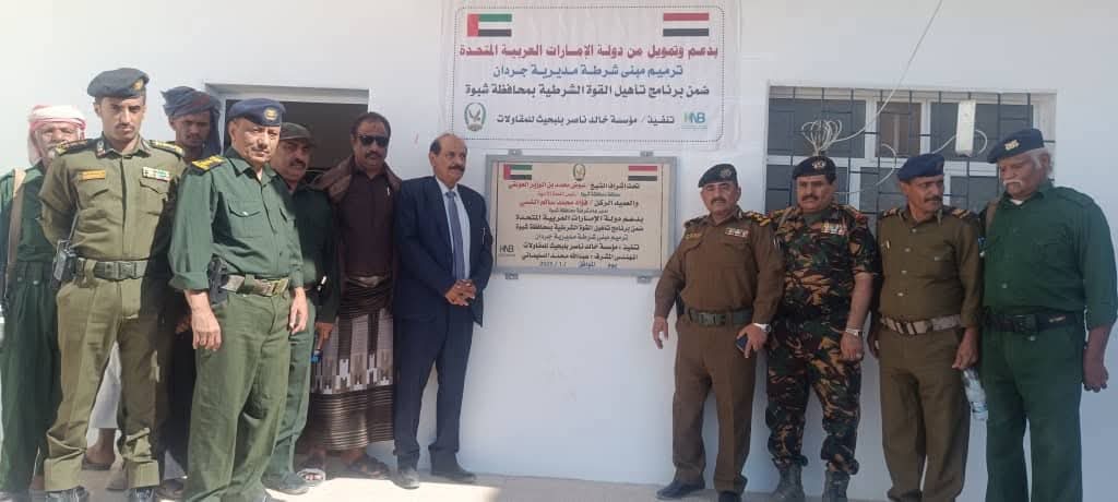 افتتح وكيل محافظة شبوة، أحمد صالح الدغاري، ومدير عام شرطة المحافظة، العميد الركن فؤاد محمد النسي، صباح اليوم، مبنى إدارة شرطة مديرية جردان، بعد تأهيله وصيانته بدعم وتمويل من الأشقاء في دولة الإمارات العربية المتحدة، وتنفيذ مؤسسة خالد ناصر بلبحيث للمقاولات.
