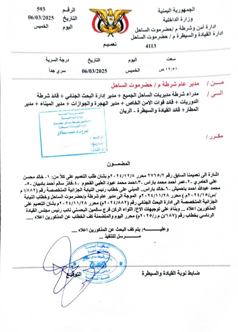 بناء على توجيهات الأخ / اللواء الركن فرج سالمين البحسني نائب رئيس مجلس القيادة الرئاسي بخطاب رقم (١٨٧/ ن م ر /٢٠٢٥م)، اصدر المدير العام لشرطة حضرموت الساحل اليوم، الخميس، تعميمًا بكف الخطاب عن 6 من رجالات حلف قبائل حضرموت ، وهم : 1- الشيخ خالد محسن العامري 2- عمر أحمد محمد باراس 3- أحمد محمد عبود العليي القحوم 4- فائز سالم أحمد بادبيان 5- محمد عبدالله أحمد باحميش 6- خالد باراس.