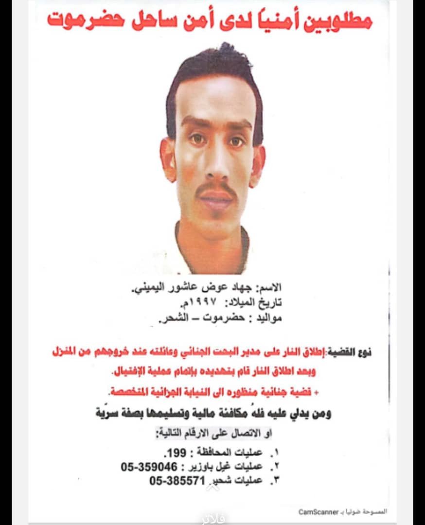 أصدرت الإدارة العامة للأمن والشرطة بساحل حضرموت، اليوم الجمعة، تعميمًا عن مطلوب أمني متهم في محاولة إغتيال مدير البحث الجنائي بساحل حضرموت العقيد هاني باشكيل الذي تعرض لإطلاق نار من قبل المتهم الأسبوع المنصرم.