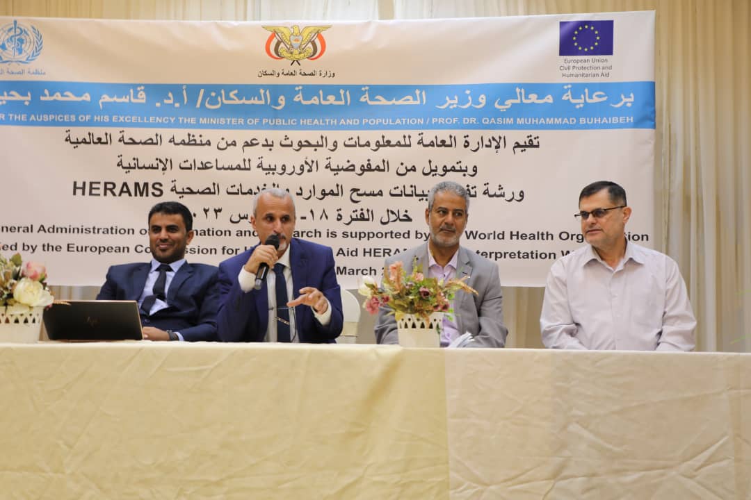 نظمت الادارة العامة للمعلومات والبحوث بوزارة الصحة العامة والسكان، بالتعاون مع منظمة الصحة العالمية، بالعاصمة المؤقتة عدن، اليوم، فعاليات ورشة تفسير بيانات مسح الموارد والخدمات الصحية (HERAMS) بتمويل المفوضية الأوروبية للمساعدات الإنسانية.
