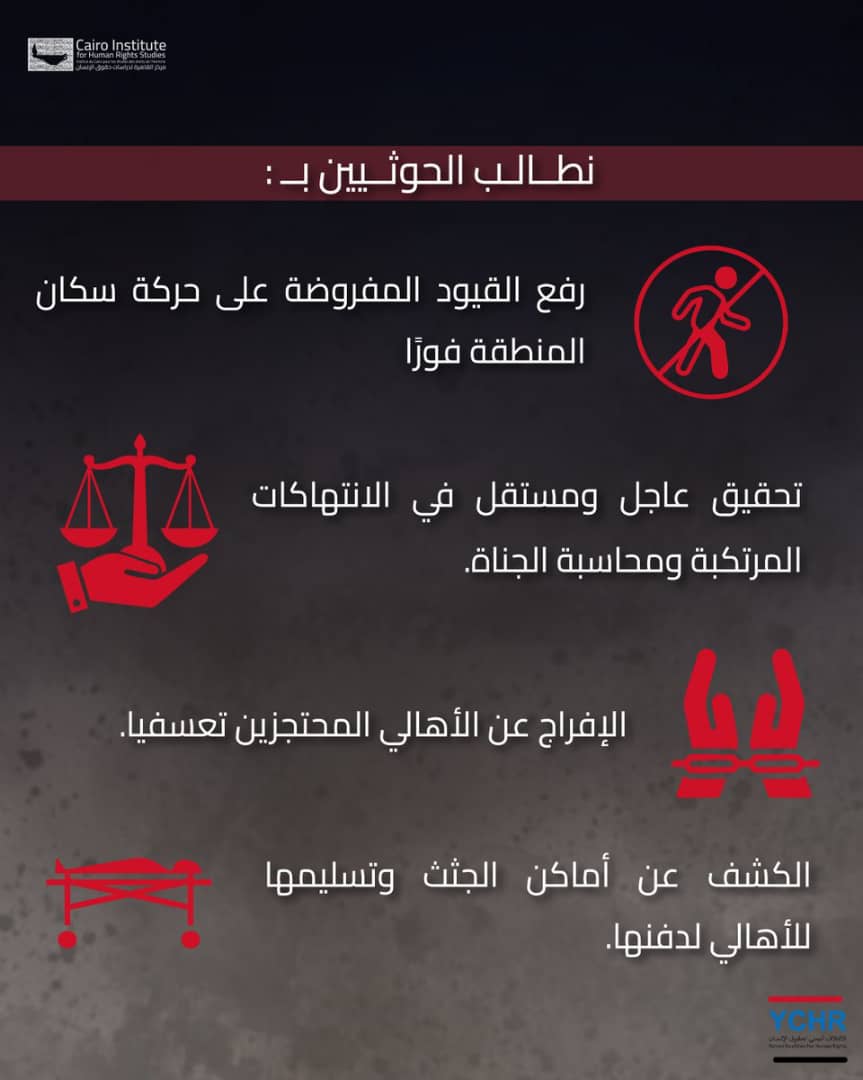 وطالب المركز والائتلاف اليمني لحقوق الانسان الحوثيين برفع القيود المفروضة على حركة سكان منطقة حنكة ال مسعود فورا وإجراء تحقيق عاجل ومستقل في انتهاكات حقوق الإنسان المرتكبة في هذه الواقعة وغيرها، ومحاسبة الجناة.