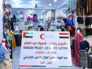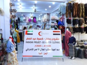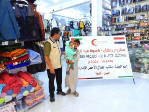 تواصلاً للدعم السخي الذي يقدمه الأشقاء في الإمارات في مختلف الجوانب الإنسانية والتنموية لمحافظة شبوة، أطلقت هيئة الهلال الأحمر الإماراتي مشروع كسوة عيد الفطر المبارك للأطفال من ذوي الاحتياجات الخاصة والأيتام من الأسر الأشد فقراً في المحافظة، ضمن المشاريع الرمضانية التي تدعمها القيادة الرشيدة لدولة الإمارات، بهدف التخفيف من معاناة الأسر المحتاجة وإدخال الفرحة على الأطفال.