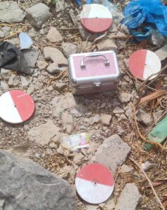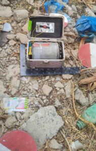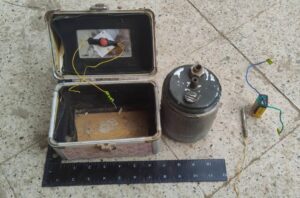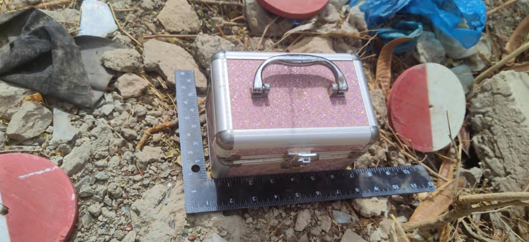 وعلى الفور، تحرك الفريق (33 مسام) إلى الموقع، وتم اكتشاف حقيبة نسائية مخصصة لأدوات التجميل تحتوي على لغم فردي ودواسة تم تطويرها حديثاً تم الصاقها بالغطاء العلوي الداخلي للحقيبة، وبطارية وصاعق كهربائي.