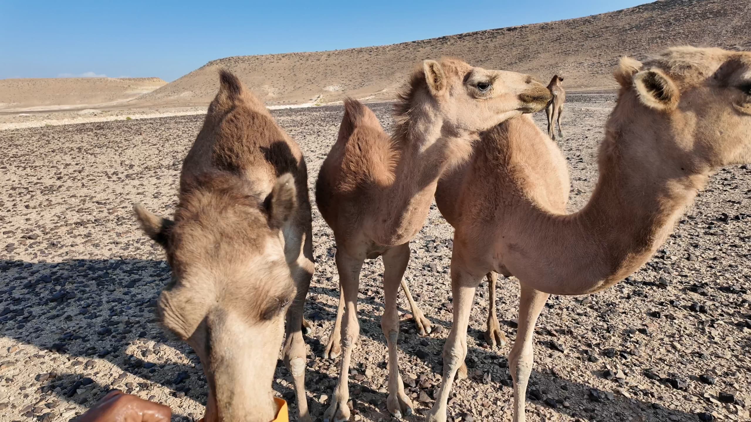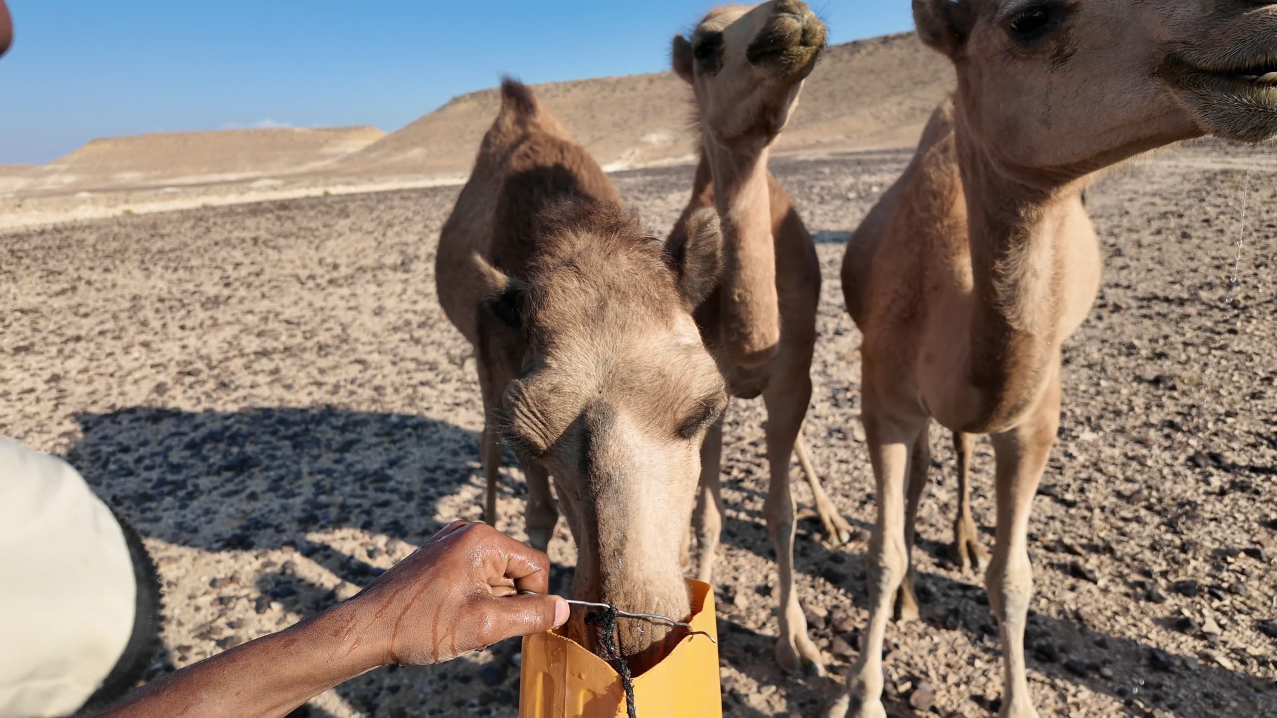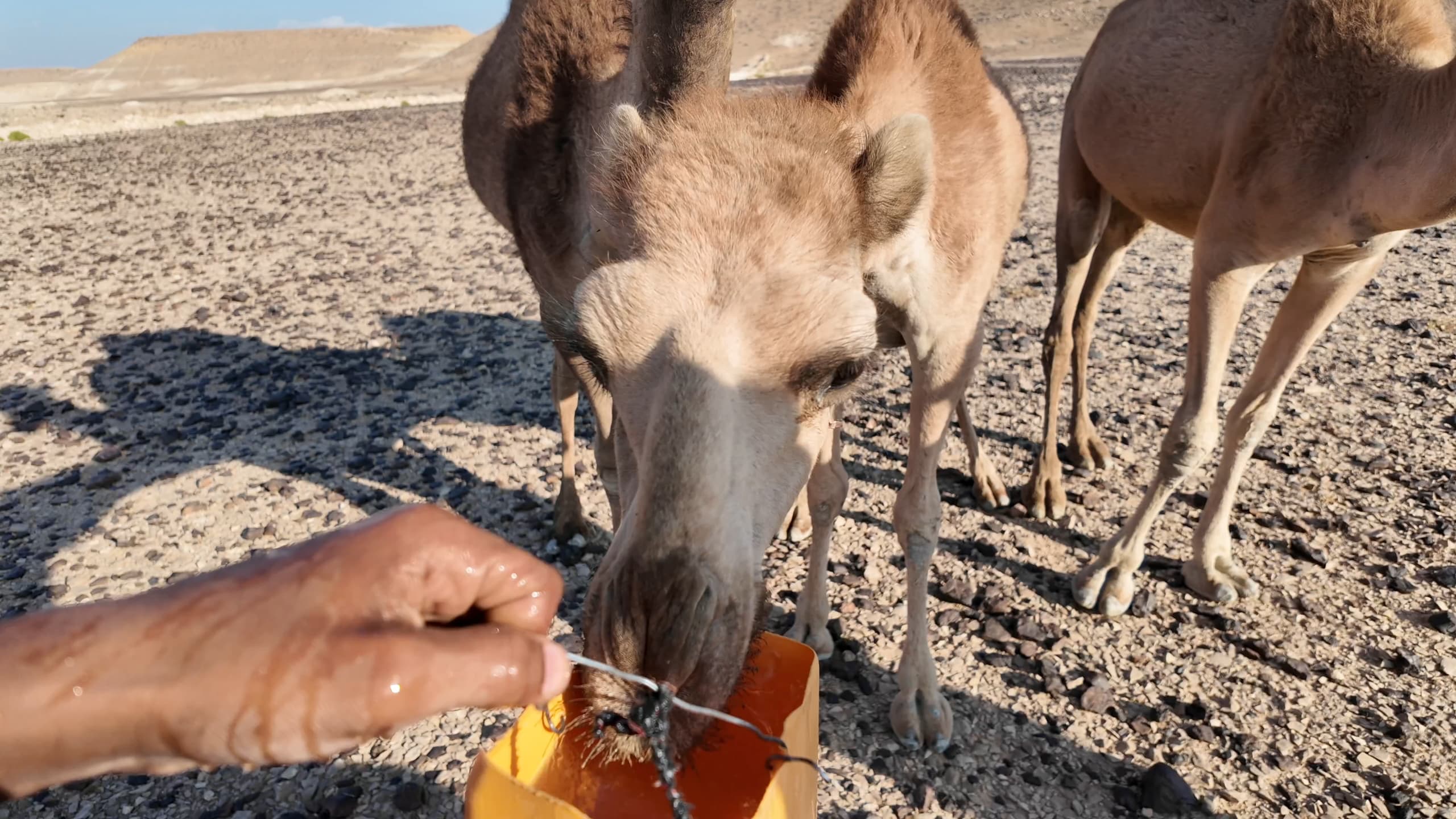 أثناء عبورهم تلك المنطقة القاحلة، لفت انتباه الفريق وجود أربعة من الإبل تجوب الأرض العطشى ببحثٍ بائس عن الماء. كان من الواضح أن تلك الإبل كانت في حالة عطش شديد، إذ بدت آثار التعب واضحة عليها.