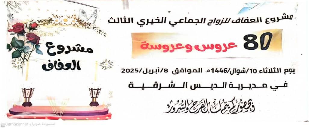 شهدت مديرية الديس الشرقية تنظيم مشروع العفاف للزواج الجماعي الخيري الثالث، لعدد ٨٠ عريساً وعروساً من أبناء المديرية، في مبادرة تسعى لتعزيز القيم الاجتماعية وتحقيق العفاف لدى الشباب.