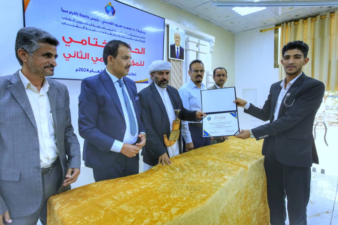 اختتمت جامعة إقليم سبأ بمحافظة مأرب اليوم، فعاليات المؤتمر العلمي الثاني لطلبة الجامعة الذي نظمته الإدارة العامة للأنشطة ورعاية الشباب التابعة لنيابة رئاسة الجامعة لشؤون الطلاب وبرعية كريمة من رئيس الجامعة الأستاذ الدكتور محمد حمود القدسي تحت شعار “نحو رؤية علمية لتنمية الإبداع الطلابي”.