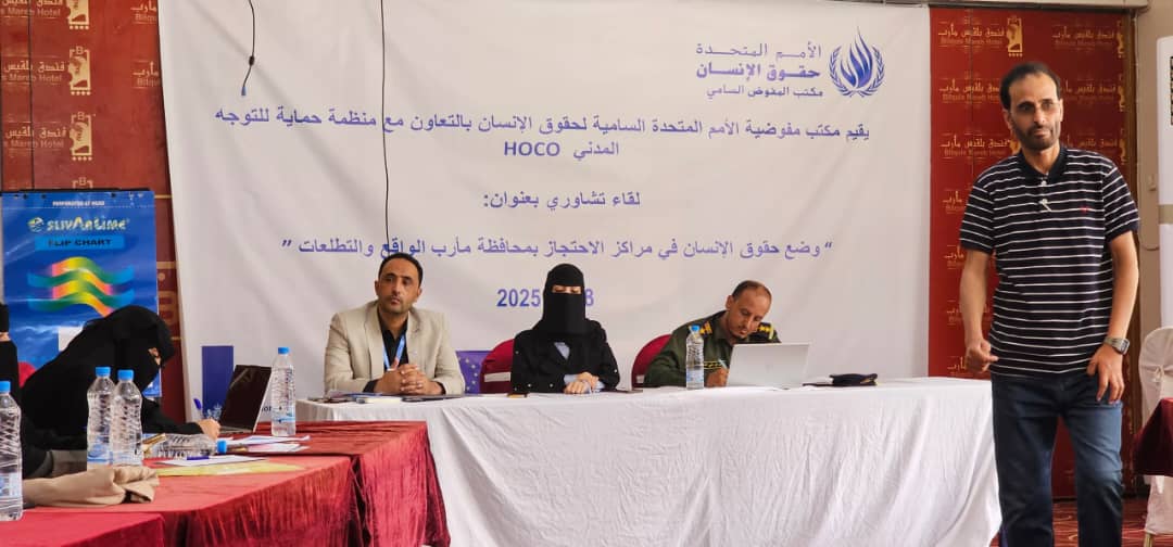 وفي كلمته أكد منسق المفوضية السامية لحقوق الانسان بمارب مهدي بالغيث على أهمية تعزيز التعاون المشترك مع السلطات المحلية لتحسين أوضاع حقوق الإنسان في مراكز الاحتجاز، والعمل على تفعيل المعايير الدولية ذات الصلة.