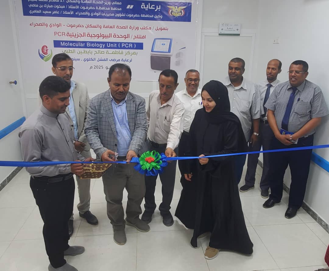 افتتح وكيل محافظة حضرموت لشؤون مديريات الوادي والصحراء عامر العامري، اليوم ، وحدة البيولوجيا الجزيئية (PCR) بمركز فاطمة صالح بابطين الطبي لرعاية مرضى الفشل الكلوي بمدينة سيئون، بتمويل من مكتب الصحة العامة والسكان بوادي حضرموت والصحراء.