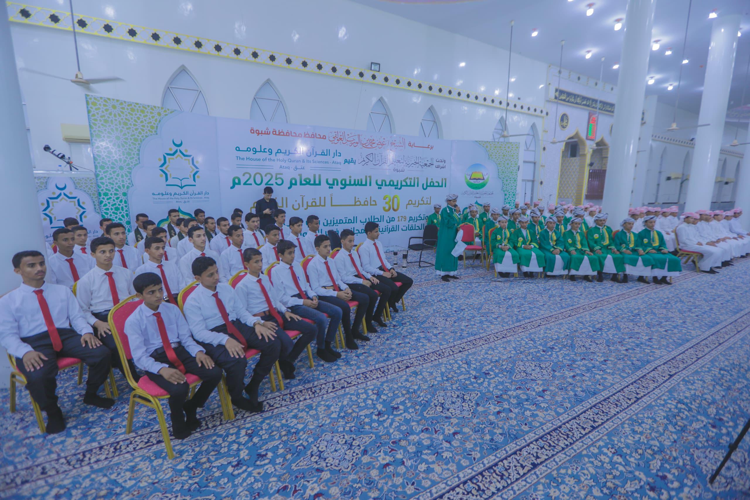 احتفت محافظة شبوة بتخريج دفعة جديدة من حفاظ كتاب الله، حيث كرمت دار القرآن الكريم وعلومه في عتق 30 حافظًا وحافظة للقرآن الكريم، إلى جانب 179 طالبًا وطالبة متميزين في مختلف المراحل الدراسية، وذلك في حفل قرآني كبير أقيم تحت رعاية محافظ المحافظة الشيخ عوض محمد بن الوزير العولقي، وبإشراف الجمعية الخيرية لتعليم القرآن الكريم.