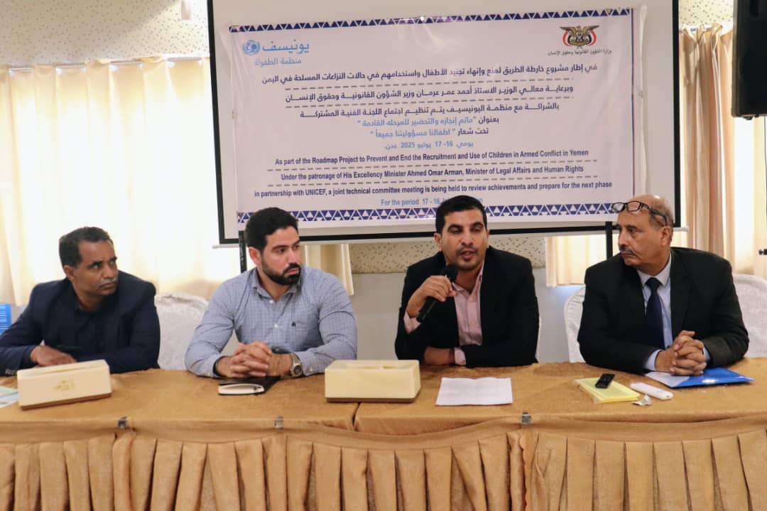 اختتمت في العاصمة المؤقتة عدن، اليوم، أعمال اجتماع اللجنة الفنية الحكومية المشتركة المعنية بمنع تجنيد الأطفال، والذي نظمته وزارة الشؤون القانونية وحقوق الإنسان، بالشراكة مع منظمة اليونيسيف، تحت شعار (أطفالنا مسؤوليتنا جميعا).