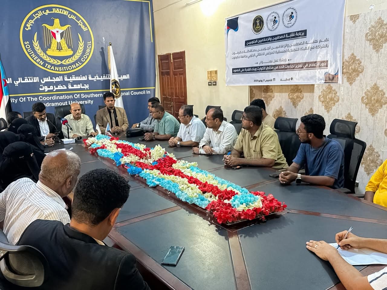 نظّمت نقابة الصحفيين والإعلاميين الجنوبيين بحضرموت بالشراكة مع منسقيّة المجلس الانتقالي الجنوبي بجامعة حضرموت، صباح اليوم، ورشة عمل بعنوان: “دور الإعلام في تعزيز إجراءات الحد من مخاطر الكوارث وبناء القدرة على الصمود”، وذلك في قاعة المنسقية بمدينة المكلا.