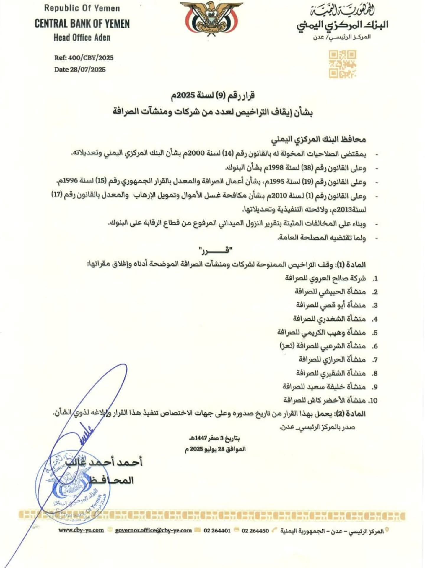 محافظ البنك المركزي يصدر قرار رقم 9 بشأن ايقاف تراخيص عدداً من شركات ومنشآت الصرافة المخالفة:-