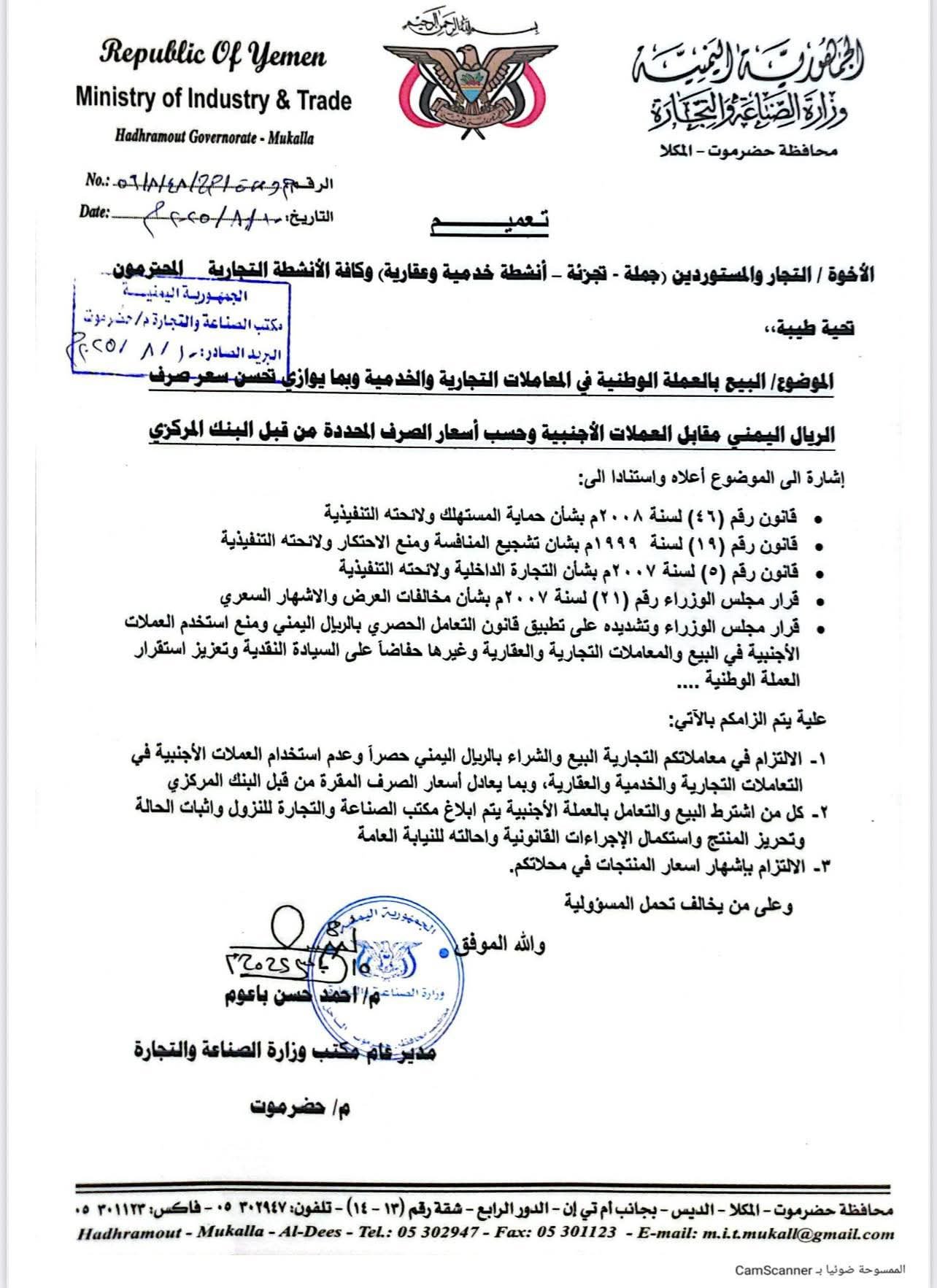 أصدر مكتب وزارة الصناعة والتجارة بمحافظة حضرموت اليوم تعميماً للتجار والمستوردين وأصحاب الأنشطة الخدمية والعقارية ووكلاء الأنشطة التجارية، شددت فيه على ضرورة الالتزام ببيع وشراء السلع والخدمات بالريال اليمني حصراً، ومنع التعامل بالعملات الأجنبية في جميع المعاملات التجارية والخدمية والعقارية، وذلك وفقاً لأسعار الصرف المحددة من قبل البنك المركزي.