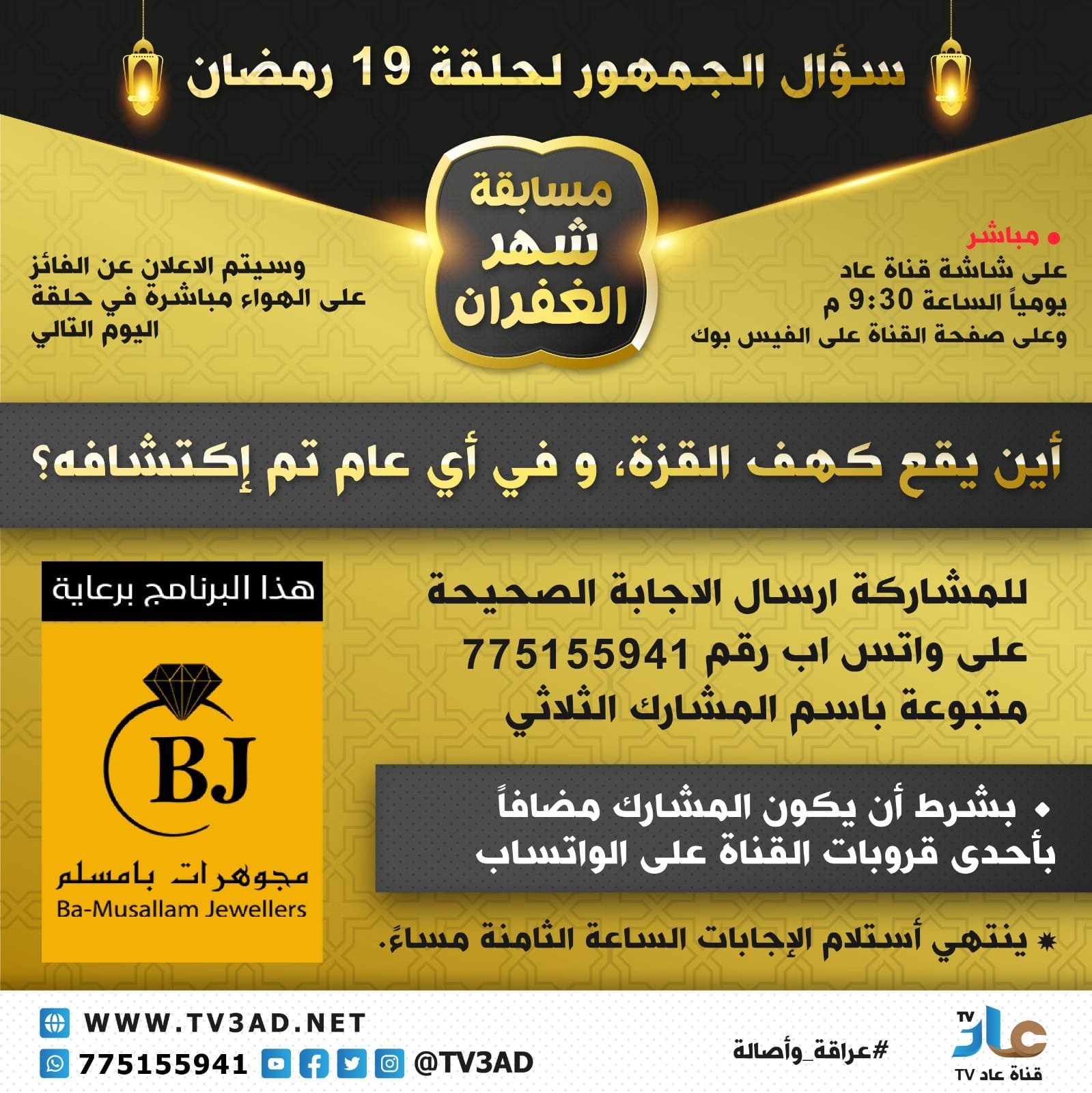 يشترط إن يكون المشارك مضاف في أحد قروبات قناة عاد ، ينتهي استلام الاجابات الساعة 8 م قبل الحلقة .