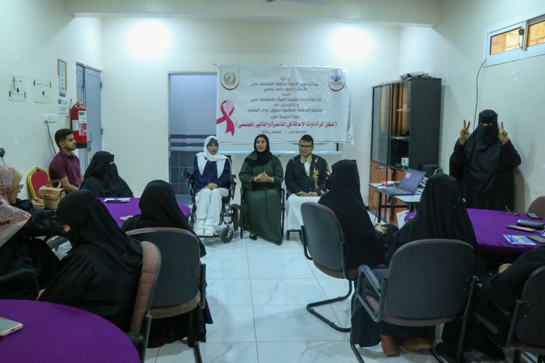 بدأت اليوم، في العاصمة المؤقتة عدن، دورة تدريبية حول تمكين النساء ذوات الإعاقة في المناصرة والتأثير المجتمعي، نظمتها الإدارة العامة لتنمية المرأة بعدن بالتنسيق مع الشبكة الوطنية لمناصرة الأشخاص ذوي الإعاقة.