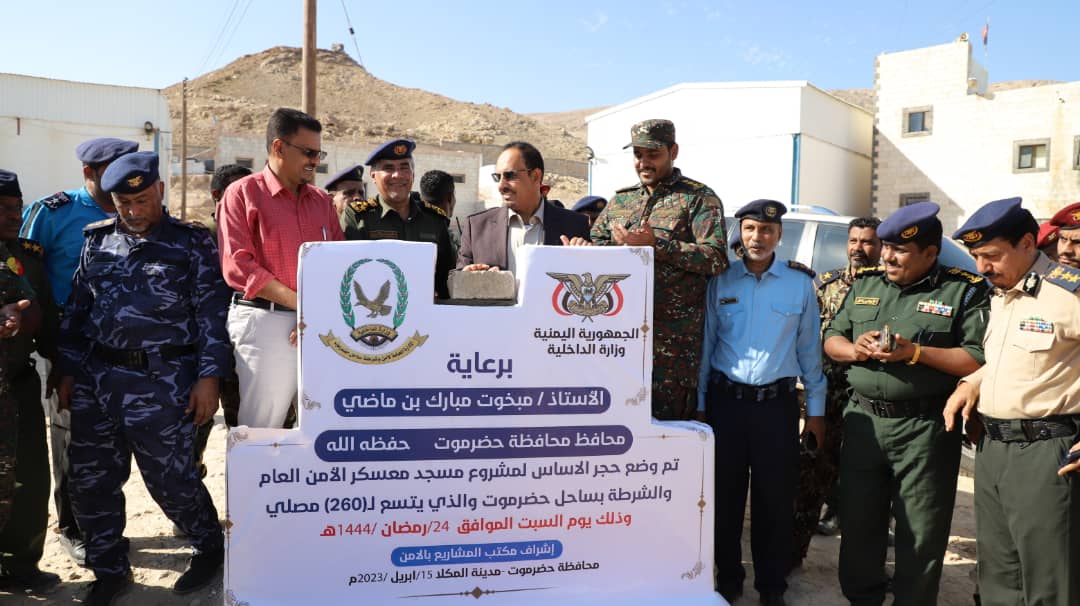 وضع محافظ حضرموت الأستاذ مبخوت مبارك بن مـاضي، اليوم بالمكلا حجر الأساس لمشروع مسجد معسكر الإدارة العامة للأمن العام والشرطة بساحل حضرموت.