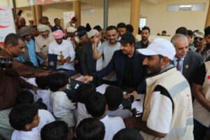 وجرى عقب افتتاح مدرسة الفاروق للتعليم الاساسي تدشين حملة مبادرة التعليم بتوزيع حقائب وأدوات مدرسية مقدمة من هيئة الهلال الأحمر الإماراتي.