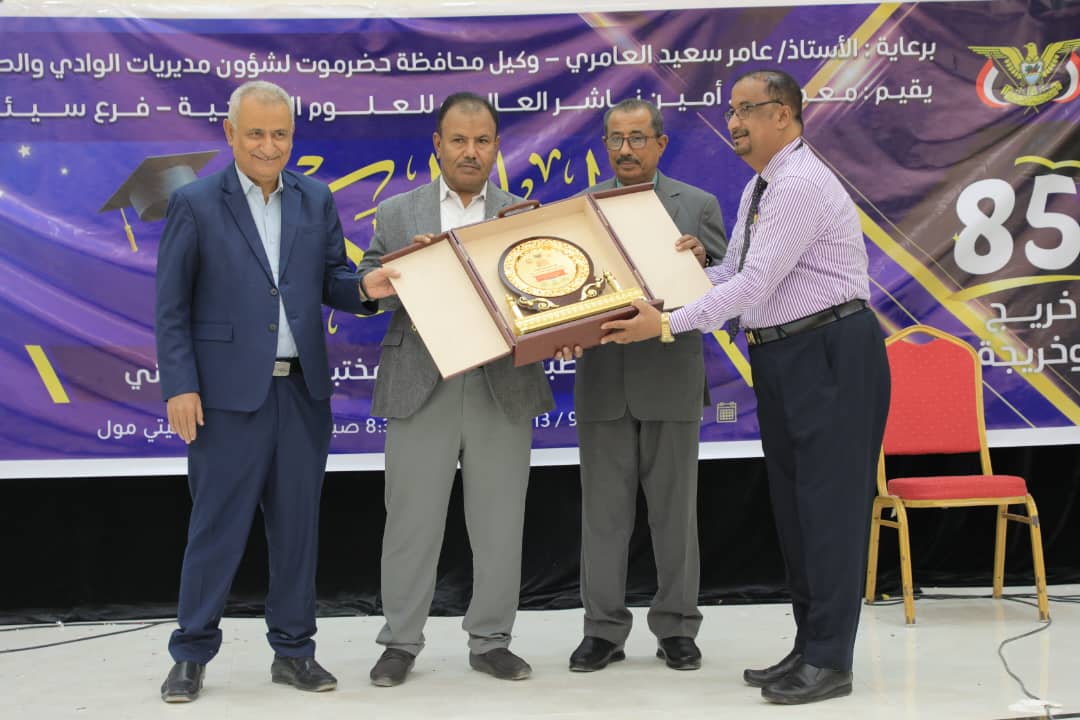 شهد وكيل محافظة حضرموت لشؤون مديريات الوادي والصحراء، الأستاذ عامر سعيد العامري، صباح اليوم السبت، الحفل الختامي والتكريمي لمعهد الدكتور أمين ناشر العالي للعلوم الصحية – فرع سيئون، وذلك لتكريم 85 خريجاً وخريجة من تخصصات (مساعد طبيب – فني مختبر – قابلة تقنية).