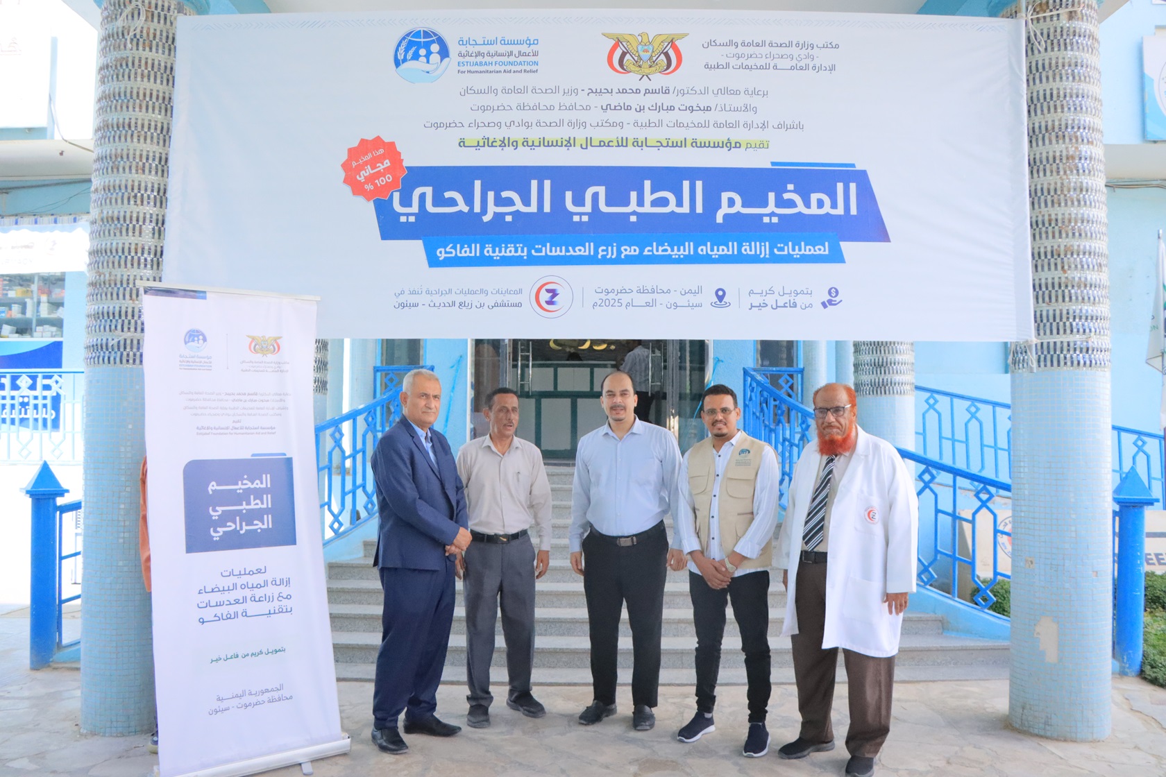 دشن الأخوين مدير عام مديرية سيئون رئيس المجلس المحلي الأستاذ خالد صالح بلفاس ومدير عام مكتب وزارة الصحة العامة والسكان بحضرموت الوادي والصحراء الدكتور هاني خالد العمودي، اليوم، بمستشفى بن زيلع الحديث بسيئون، المخيم الطبي الجراحي المجاني لعمليات إزالة المياه البيضاء وزراعة العدسات بتقنية الفاكو، تقيمه مؤسسة استجابة للأعمال الإنسانية والاغاثية وبتمويل كريم من فاعل خير، برعاية معالي وزير الصحة العامة والسكان الأستاذ الدكتور قاسم محمد بحيبح، ومحافظ محافظة حضرموت الأستاذ مبخوت مبارك بن ماضي، ووكيل محافظة حضرموت لشئون مديريات الوادي والصحراء الأستاذ عامر سعيد العامري، بأشراف الإدارة العامة للمخيمات بوزارة الصحة ومكتب وزارة الصحة بحضرموت الوادي والصحراء وتنفذه مستشفى بن زيلع الحديث بسيئون.