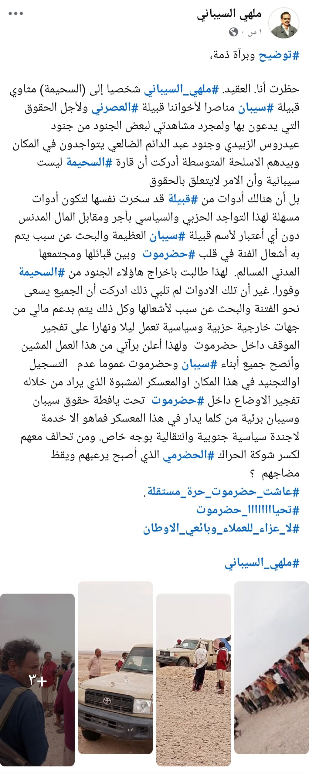واختتم منشوره بالتأكيد على تمسكه بسيادة حضرموت واستقلالها، داعيًا الجميع إلى الحفاظ على الأمن والسلام داخل المحافظة.