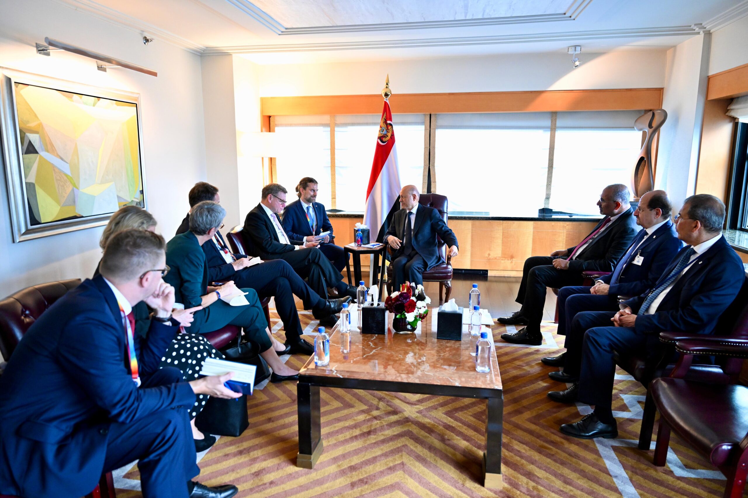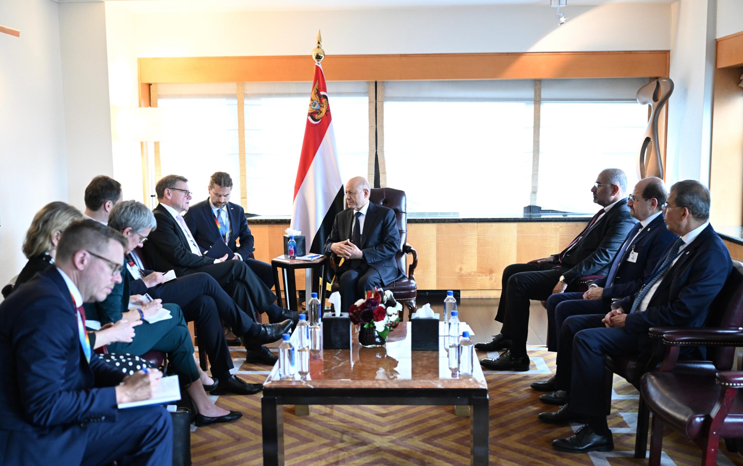 كما تطرق اللقاء الى التهديدات الحوثية المستمرة للسلم والامن الدوليين، بدعم وثيق من النظام الايراني، من خلال الهجمات المتواصلة على خطوط الملاحة الدولية والتخادم الصريح مع التنظيمات الإرهابية، فضلا عن تزايد المخاطر المترتبة على استمرار تدفق السلاح الايراني الى المليشيات الارهابية.