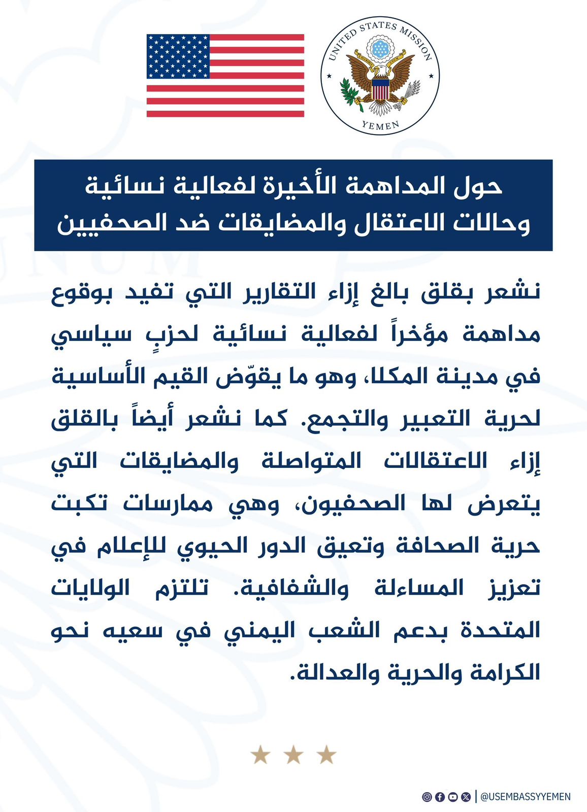 أعربت سفارة الولايات المتحدة الأمريكية لدى اليمن عن قلقها البالغ إزاء التقارير التي أفادت بوقوع مداهمة مؤخراً لفعالية نسائية تابعة لحزب سياسي بمدينة المكلا، معتبرة أن مثل هذه الإجراءات تُقوّض القيم الأساسية لحرية التعبير والتجمع.