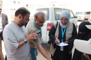 رافقهم في النزول الأستاذ هاني مانع مسؤول المعلومات بمنظمة اليونيسف و الاستاذ عمر باجبار منسق البنك الدولي بالمحافظة و الاستاذ خالد الكلدي مدير التحصين والتثقيف الصحي بمكتب وزارة الصحة العامة والسكان و الأستاذ شريف رويعي مدير التثقيف الصحي بالمديرية و الأستاذة حنان جوبان مسؤول التحصين بالمديرية و الأستاذ وجدان صحاليل الحاشد المجتمعي للمؤسسة الطبية الميدانية.