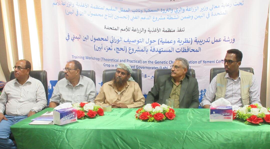 اختتمت صباح اليوم في العاصمة عدن فعاليات ورشة التوصيف الوراثي لمحصول البن اليمني،التي نظمتها منظمة الأغذية والزراعة للأمم المتحدة (الفاو) بالتنسيق مع وزارة الزراعة والري والثروة السمكية والهيئة العامة للبحوث والإرشاد الزراعي،وبرعاية معالي وزير الزراعة والري والثروة السمكية اللواء سالم عبدالله السقطري،ونائب الممثل المقيم لمنظمة الفاو في اليمن،وذلك في إطار مشروع الدعم الفني لتحسين وإنتاج البن.