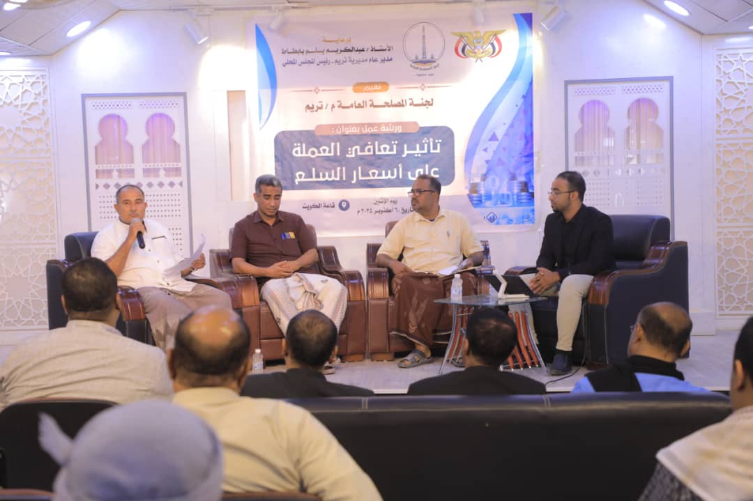 برعاية وحضور مدير عام مديرية تريم الأستاذ عبدالكريم يسلم بابطاط، وبإشراف وتنظيم لجنة المصلحة العامة بمديرية تريم، عُقدت يوم أمس الإثنين 6 أكتوبر 2025م، ورشة عمل موسعة بعنوان: “تأثير تعافي العملة على أسعار السلع”، وذلك بحضور رسمي وشعبي واسع ضم عددًا من المسؤولين والتنفيذيين والتجار، بالإضافة إلى عدد من الوجهاء وعُقّال الحارات بالمديرية.
