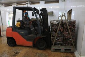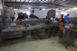 واستعرض مدير المصنع مراحل سير عملية إنتاج الأسماك المعلبة، بدءًا من مرحلة الاستلام التي يتم فيها استقبال وفرز وتجميد الأسماك، مرورًا بمرحلة التجهيز التي تشمل نزع الأحشاء والتقطيع والطبخ، ثم مرحلة التقشير التي يُزال فيها الجلد واللحم الأسود والعظام، وصولًا إلى مرحلة التعليب والتعقيم، فمرحلة الإنتاج الجاهز للتوزيع والتصدير.
