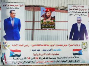كما ألقى رئيس المجلس الانتقالي بالمحافظة، الشيخ لحمر علي لسود، كلمة بالمناسبة، أكد فيها أن ثورة أكتوبر كانت ثمرة نضال طويل خاضه الأحرار في سبيل الكرامة الوطنية، مشدداً على أهمية استلهام روح الثورة في مواجهة التحديات الراهنة، منوّهًا بالدور البطولي الذي جسّده الشهيد العقيد احمد محسن السليماني، معتبراً أن ذكراه تمثل رمزاً للفداء والانتماء الوطني الصادق.