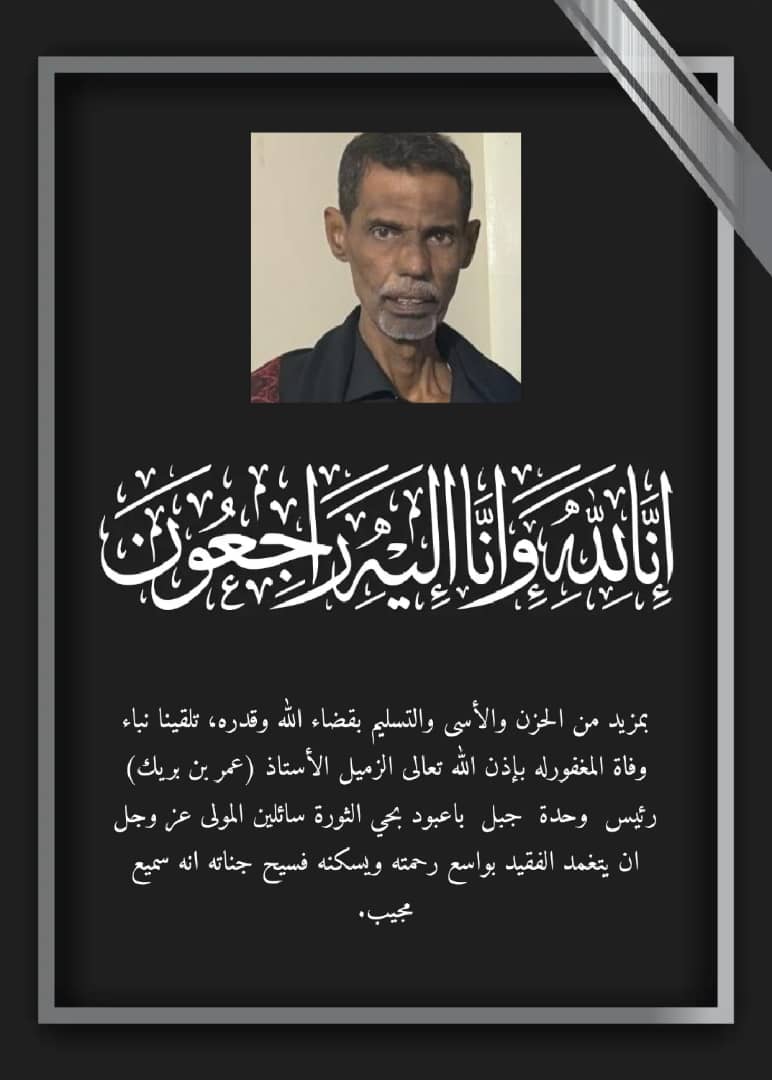 بأعمق مشاعر الحزن والأسى، عبر رئيس اللجان المجتمعية في مديرية مدينة المكلا، المهندس عبدالله محمد بن علي الحاج، أصالة عن نفسه و بالنيابة عن قيادة اللجان المجتمعية وكافة العاملين والمنتسبين إليها، بالإضافة إلى جميع رؤساء الأحياء والوحدات السكنية وأعضاء اللجان المجتمعية في مديرية مدينة المكلا، عن خالص التعازي والمواساة في وفاة المغفور له بإذن الله تعالى، رئيس وحدة جبل باعبود بحي الثورة، الأستاذ عمر بن بريك لجميع أفراد أسرته الكريمة في هذا المصاب الجلل. سألين الله العلي القدير أن يمنحكم الصبر والسلوان، وأن يرحم الفقيد برحمته الواسعة. إنا لله وإنا إليه راجعون.