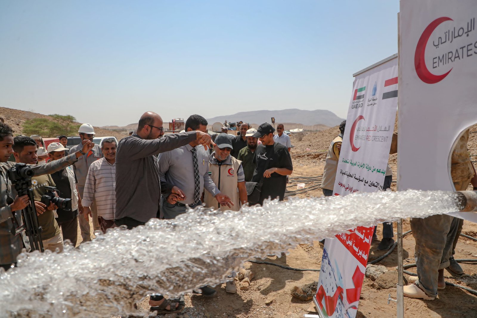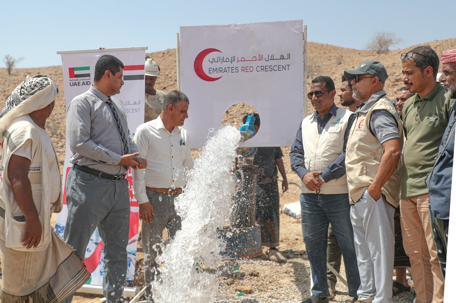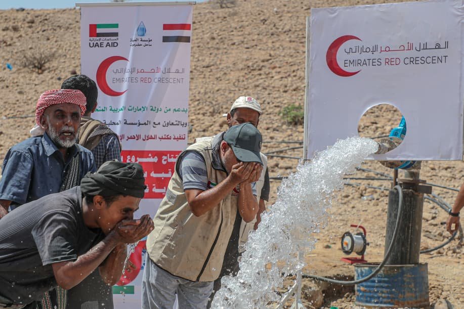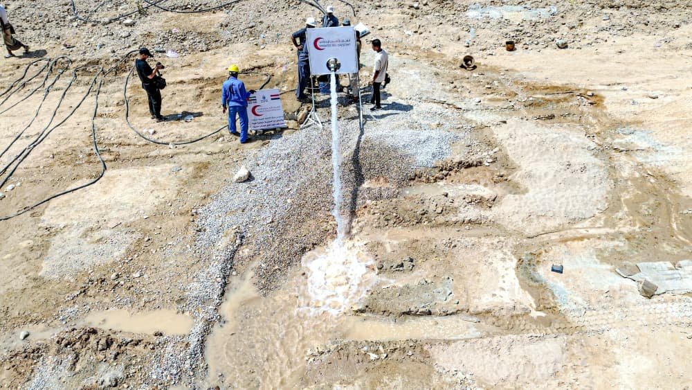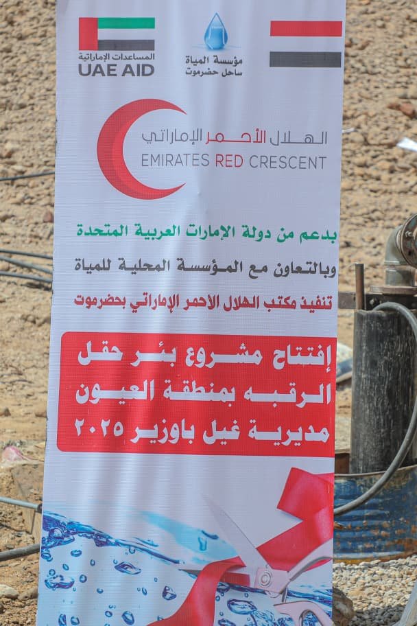 دشنت هيئة الهلال الأحمر الإماراتي اليوم مشروع حفر وتشغيل بئر مياه ارتوازية جديدة في حقل الرقبة بمنطقة العيون بمديرية غيل باوزير بمحافظة حضرموت، وذلك ضمن جهودها المستمرة لدعم قطاع المياه وتحسين الخدمات الأساسية في اليمن.