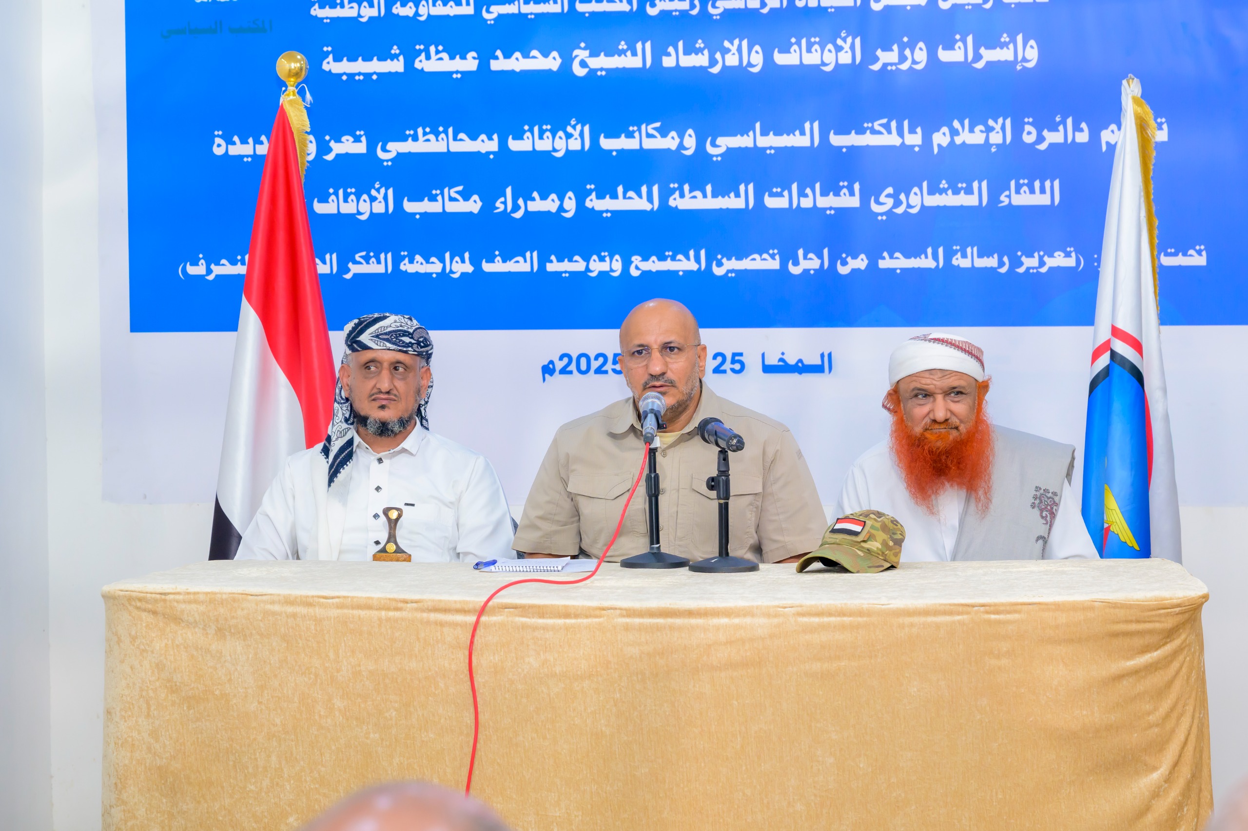 واكد طارق صالح في كلمته خلال اللقاء التشاوري للسلطة المحلية ومكاتب الأوقاف بمحافظتي تعز والحديدة، الذي نظمته دائرة الإعلام والثقافة والإرشاد بالمكتب السياسي، على أهمية توحيد وترشيد الخطاب الديني في المساجد، وتعزيز الوعي الديني والوطنـي لمواجهة محاولات الحوثي نشر الفكر الإيراني وتشييع المجتمع..مشددًا على أن المعركة ضد المليشيا “مستمرة” وأنها ليست مجرد مواجهة عسكرية بل معركة فكرية تتطلب موقفاً ووعيًا داخليًا لدى المقاتلين والمجتمع.